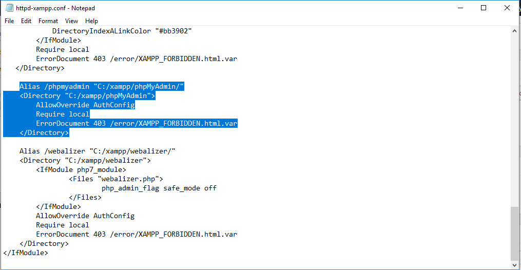 Alias /phpmyadmin "C:/xampp/phpMyAdmin/"<Directory "C:/xampp/phpMyAdmin">AllowOverride AuthConfigRequire localErrorDocument 403 /error/XAMPP_FORBIDDEN.html.var</Directory>