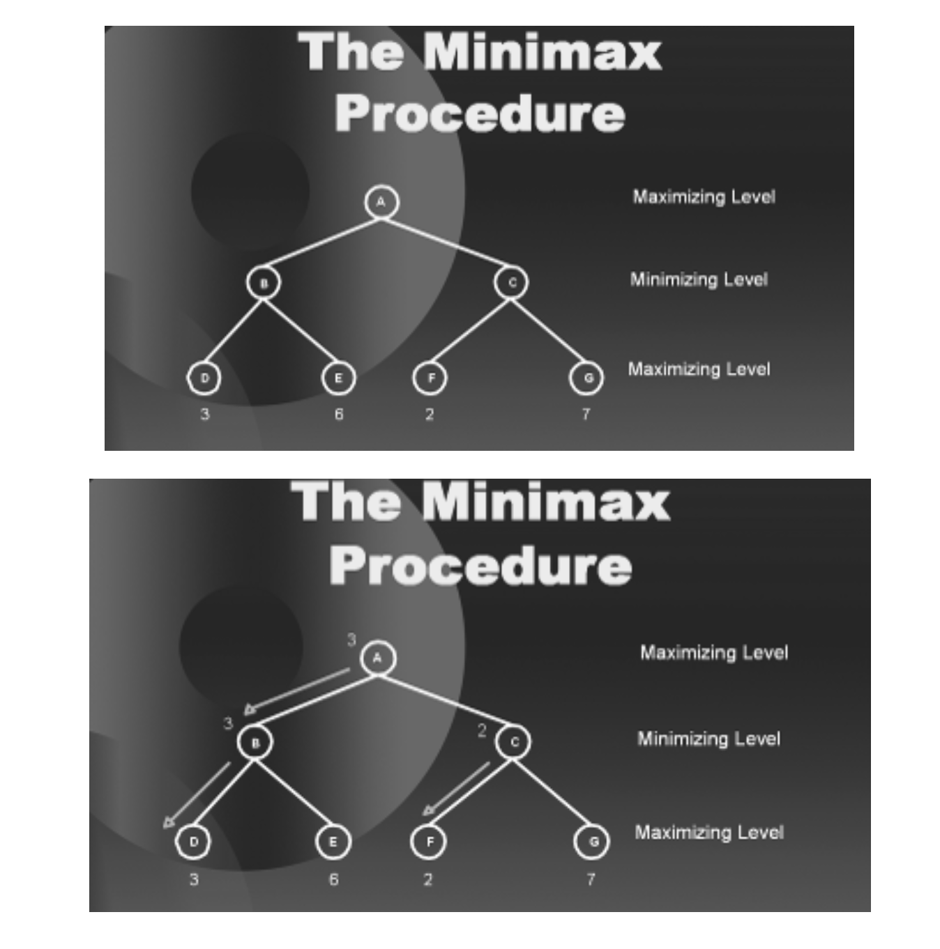 Structure and Strategies for State Space Search AIStanding at node A the maximizer wants to decide which node to visit next, that is, choose between B or C. The maximizer wishes to maximize the score so apparently 7 being the maximum score, the maximizer should go to C and then to G. But when the maximizer will reach C the next turn to select the node will be of the minimizer, which will force the game to reach configuration/node F with a score of 2.