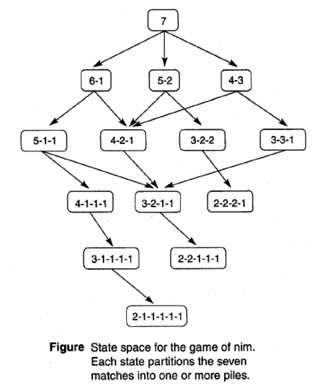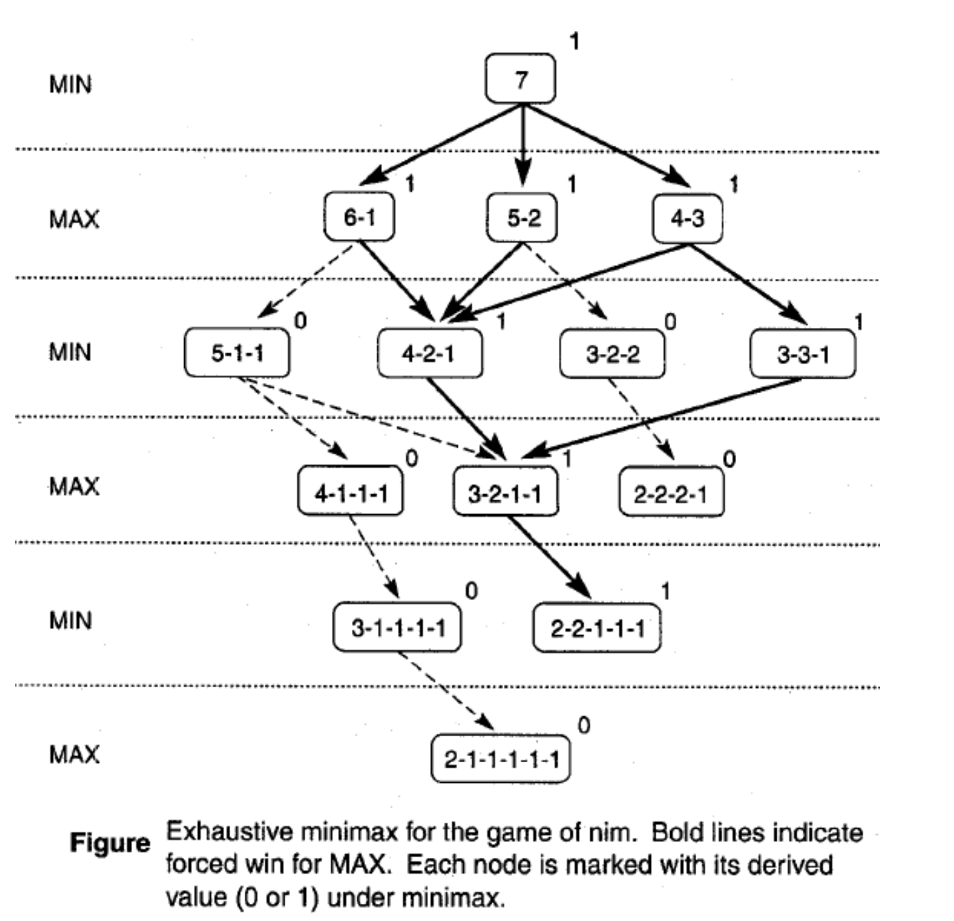 To fully understand the Minimax procedure consider a game “nim”. To play nim, a number of tokens are placed on a table between the two opponents; at each move, the player must dive a pile of tokens into two nonempty piles of different sizes. Thus, 6 tokens can be divided into piles of 5 and 1 or 4 and 2, but not 3 and 3. The player who can no longer make a move loses the game.