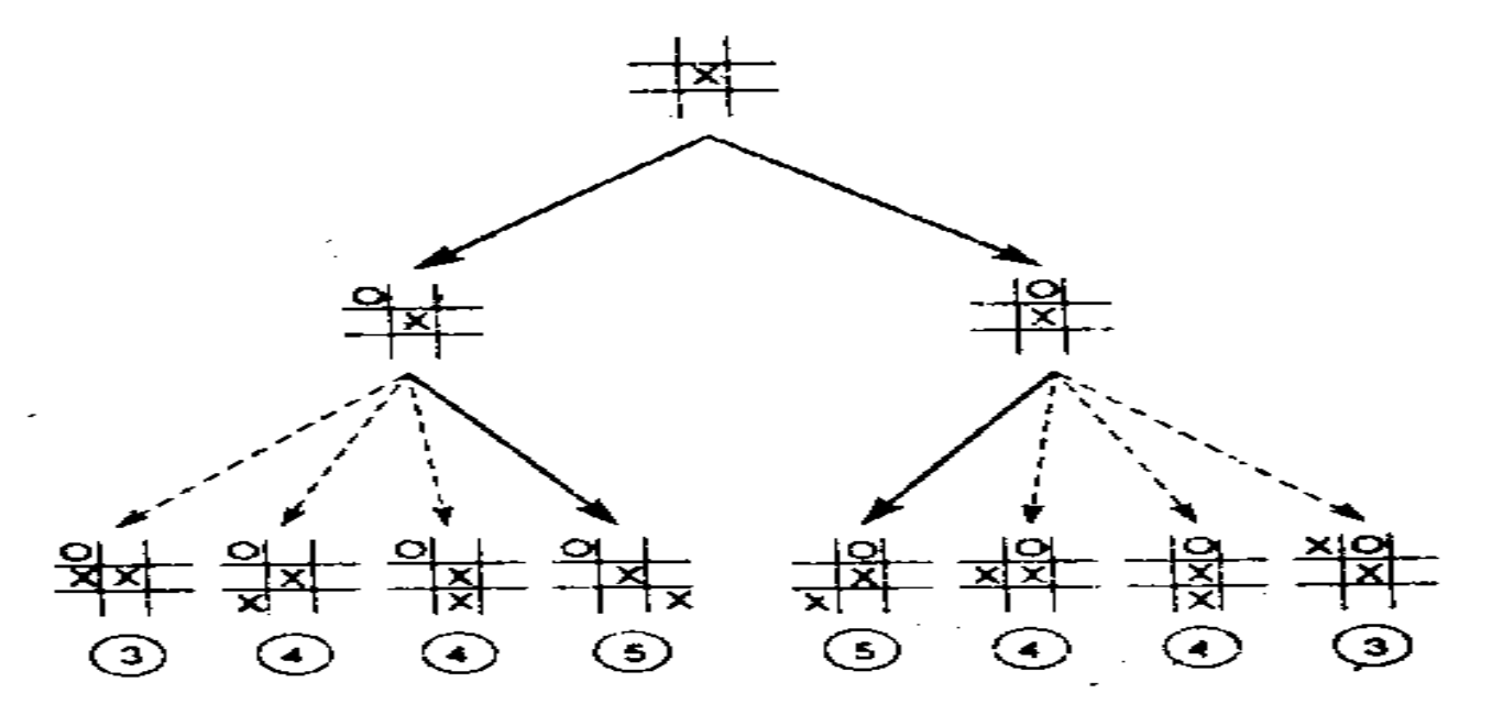 The value that is thus assigned to each state indicates the value of the best state that this player can hope to achieve. These derived values are used to choose among possible moves. The above diagram shows the resulting win path for Max in bold arrows. In starting state, all of MIN’s possible first moves lead to nodes with a derived value of 1, the second play MAX can always try to win the game, regardless of MIN’s first move. MIN can pick any first move. By selecting the most favorable option MAX is trying MIN to lose the game.