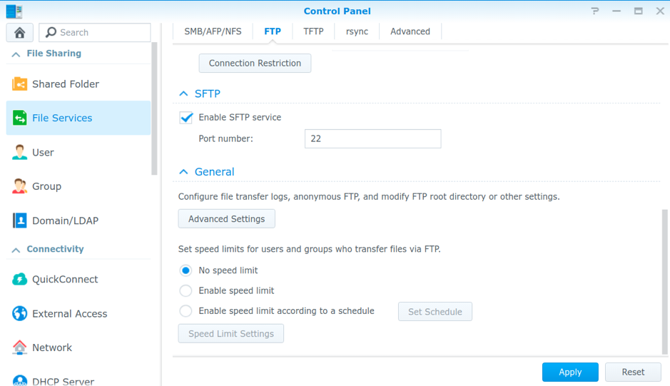 Setting this up was simple: I just added the NAS as an SFTP share (and as I mentioned earlier rsync, SSH, and several other protocols aren’t enabled on the Synology by default — so make sure to enable these before trying to initiating backups to it over the LAN).