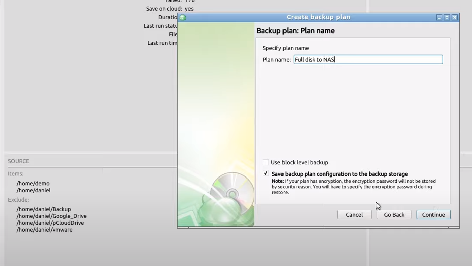 After telling Cloudberry what not to backup, I had created a full disk backup to the NAS running over the local network. Unlike grsync, I could put this on schedule. Like rsync, it only backs up changes. Several backup plans can be set to run at different time intervals in order to create several snapshots / restore points just like Timeshift.