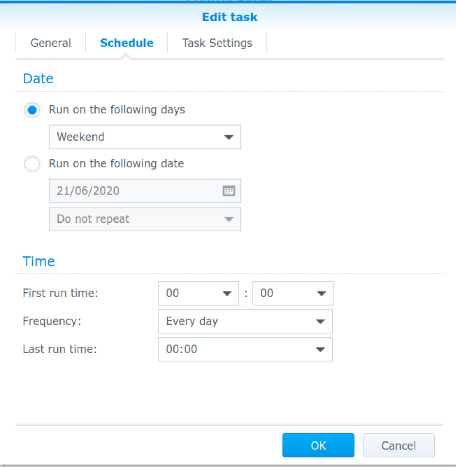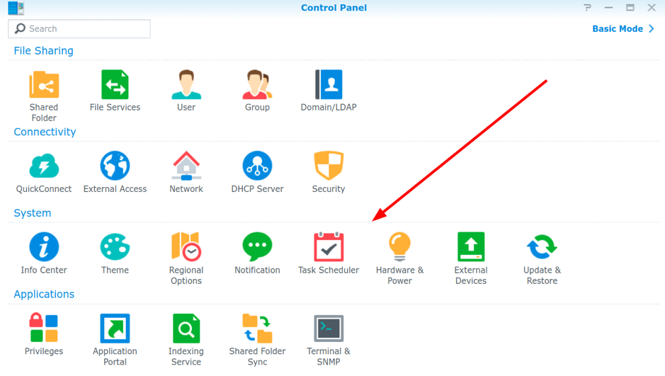 Users can create weekly and monthly snapshot folders and run rsync jobs between these on the NAS itself (advantage: computer needn’t be on). To set up crons, look for the ‘Task Scheduler’ icon from within DSM: