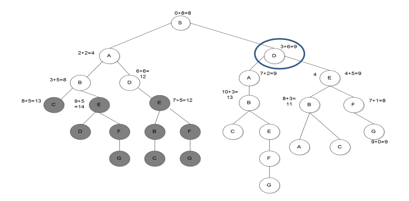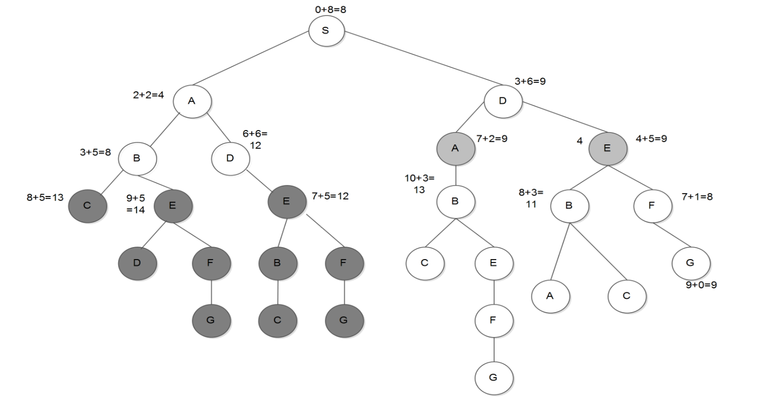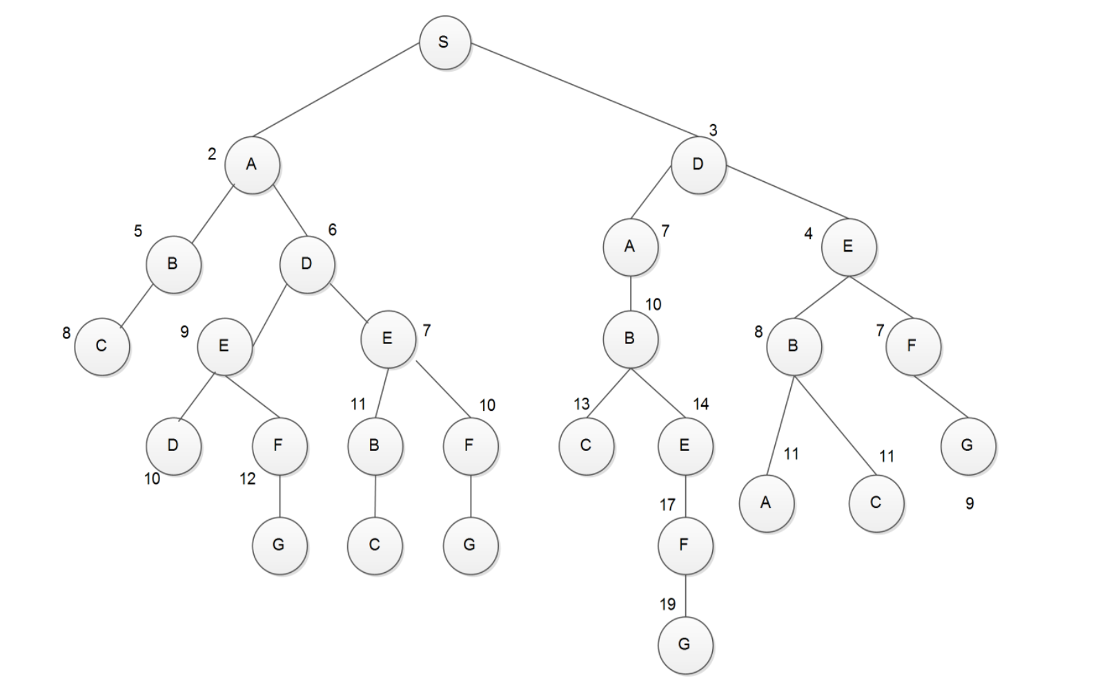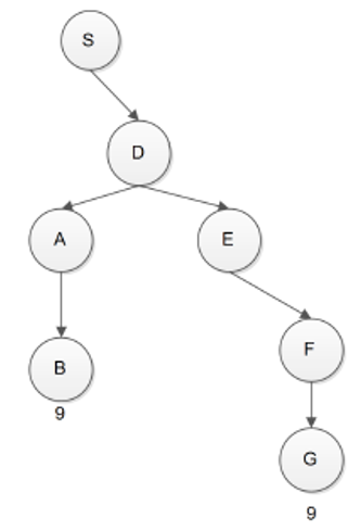 The length of the complete path from S to G, S-D-E-F-G is 9. Similarly, the length of the partial path S-D-A-B also is 9 and any additional movement along a branch will make it longer than 9.