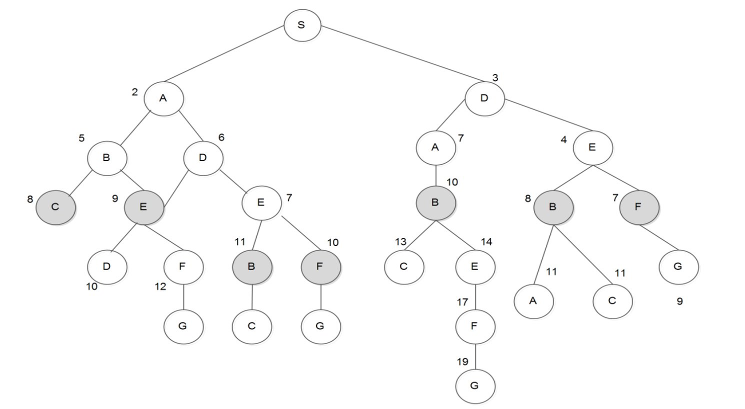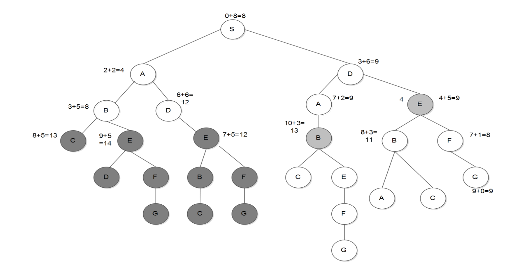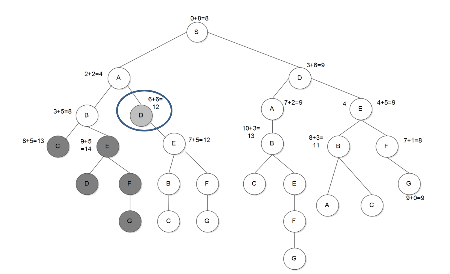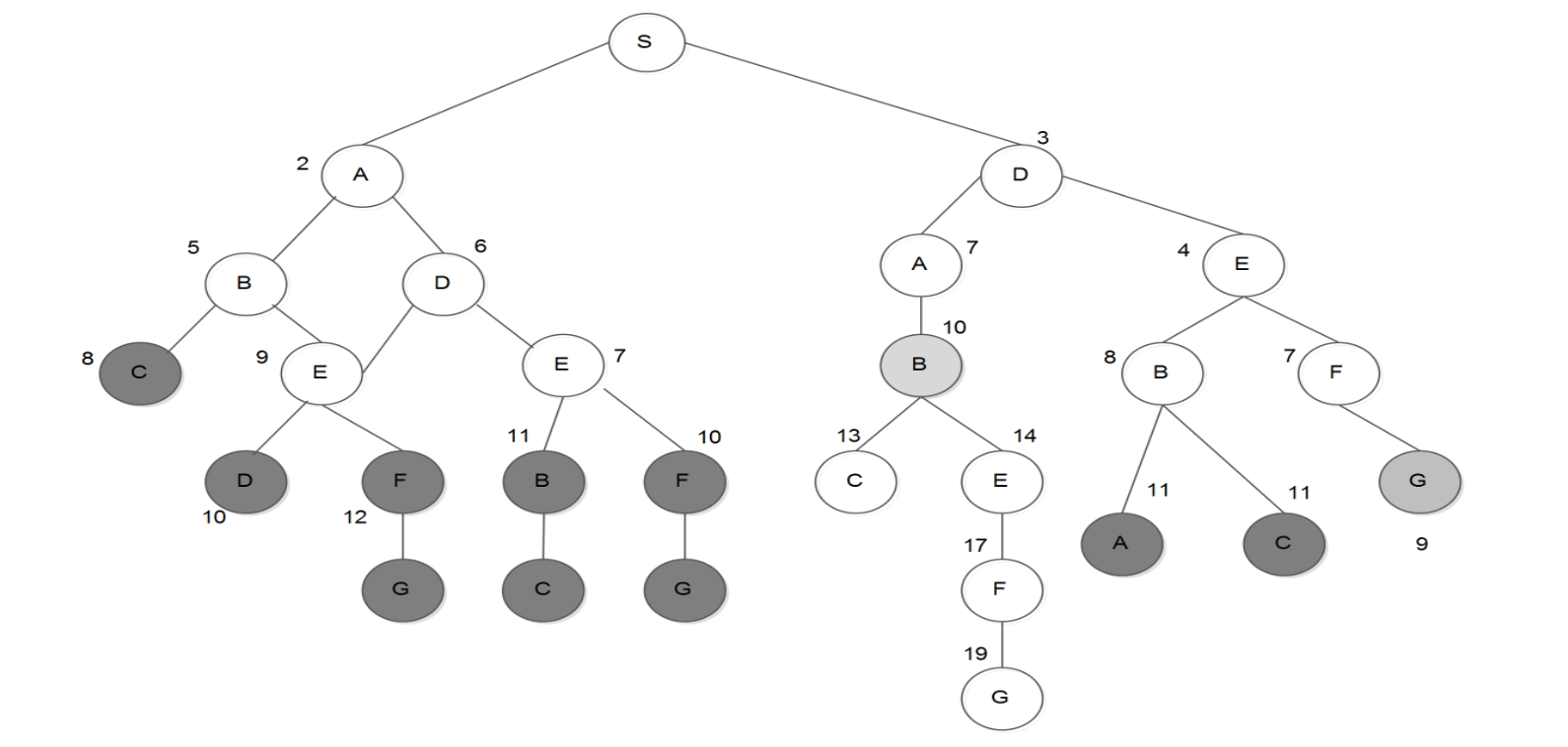 The length of the complete path from S to G, S-D-E-F-G is 9. Similarly, the length of the partial path S-D-A-B also is 9 and any additional movement along a branch will make it longer than 9.