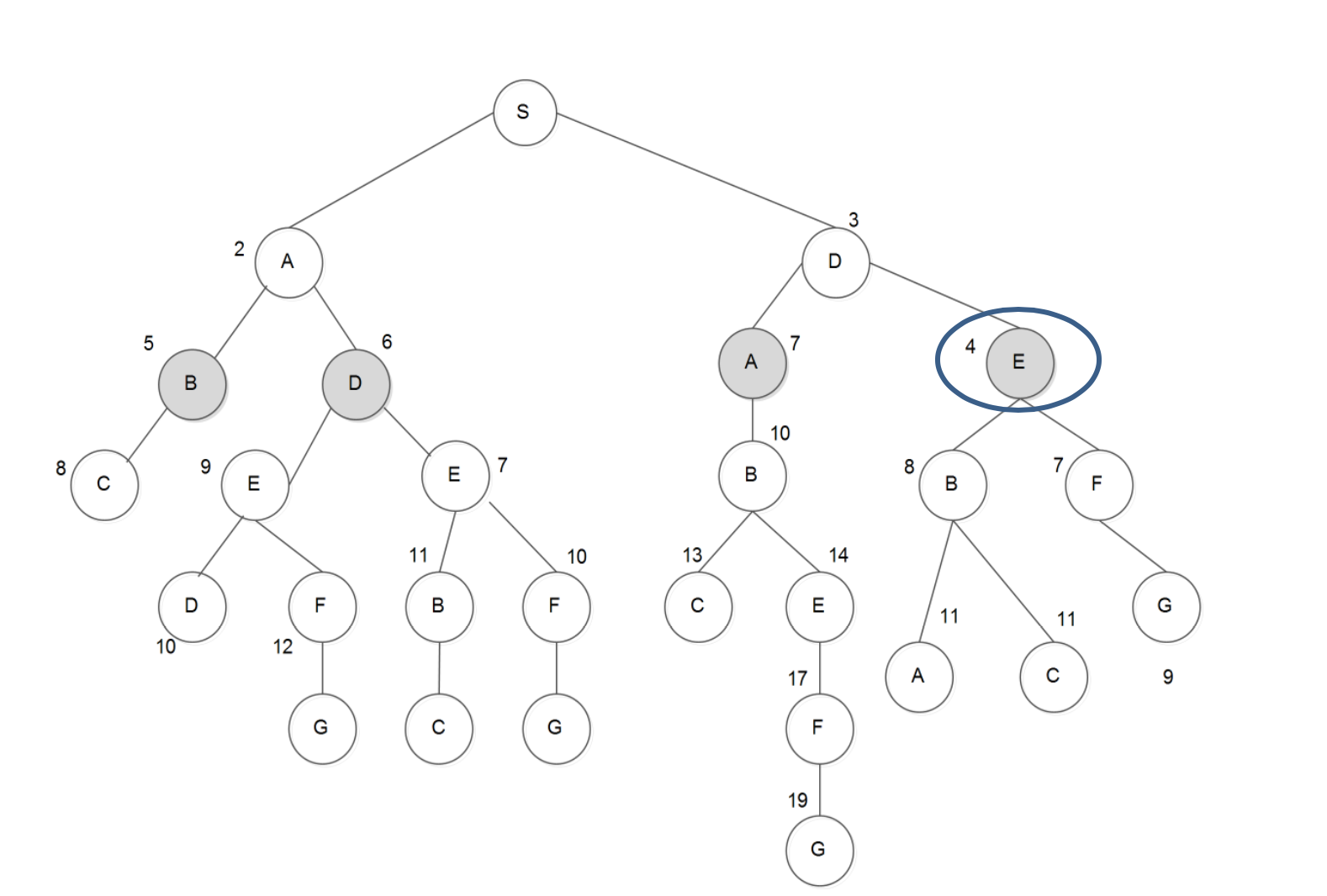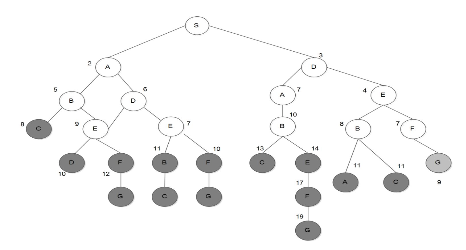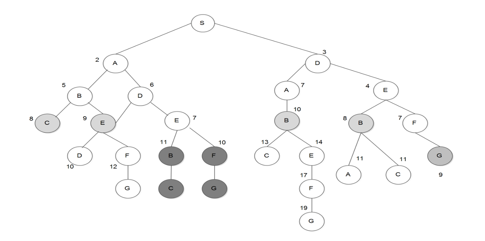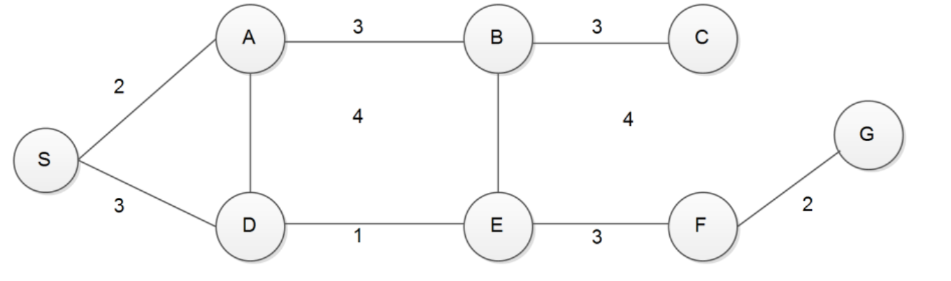 The length of the complete path from S to G, S-D-E-F-G is 9. Similarly, the length of the partial path S-D-A-B also is 9 and any additional movement along a branch will make it longer than 9.