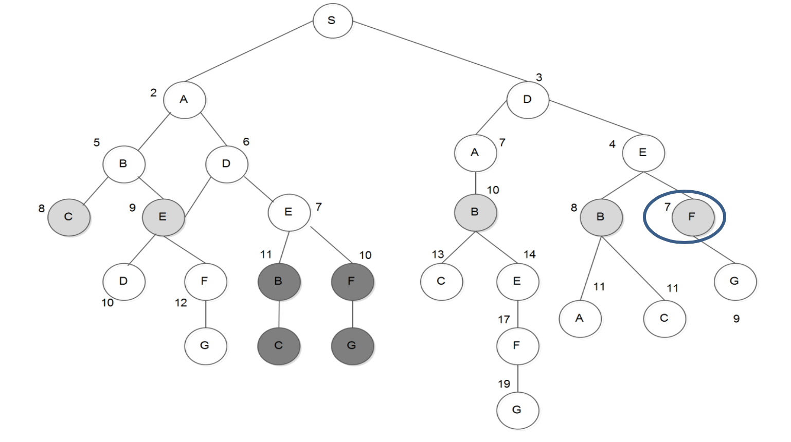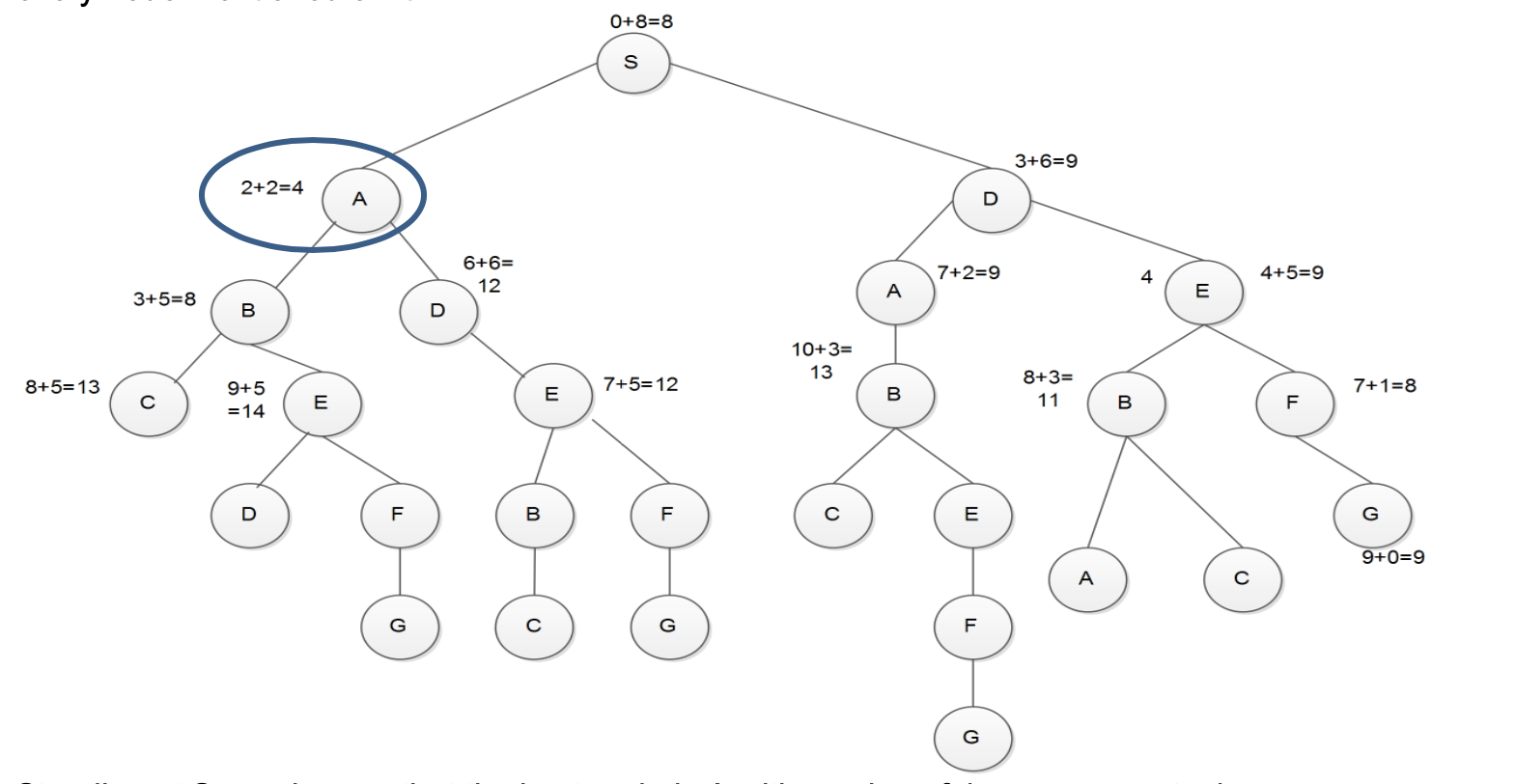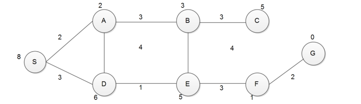 The values on the nodes shown in yellow are the underestimates of the distance of a specific node from G. The values on the edges are the distance between two adjacent cities.
