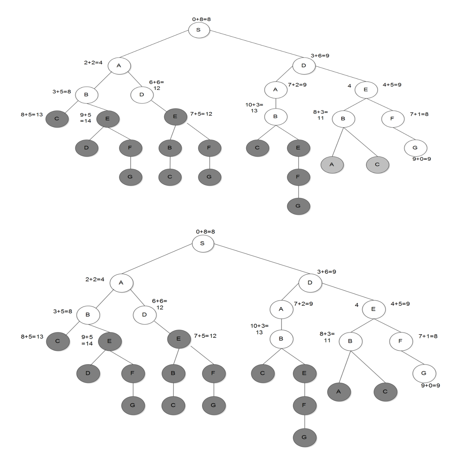 The idea of estimates is that we can travel in the solution space using a heuristic estimate. By using “guesses” about the remaining distance as well as facts about distance already accumulated we will be able to travel in the solution space more efficiently. Hence we use the estimates of the remaining distance. A problem here is that if we go with an overestimate of the remaining distance then we might lose a solution that is somewhere nearby. Hence we always travel with underestimates of the remaining distance. We will demonstrate this improvement with an example.