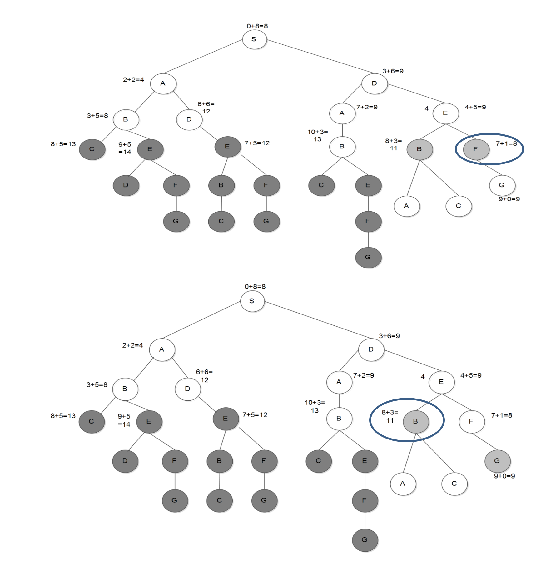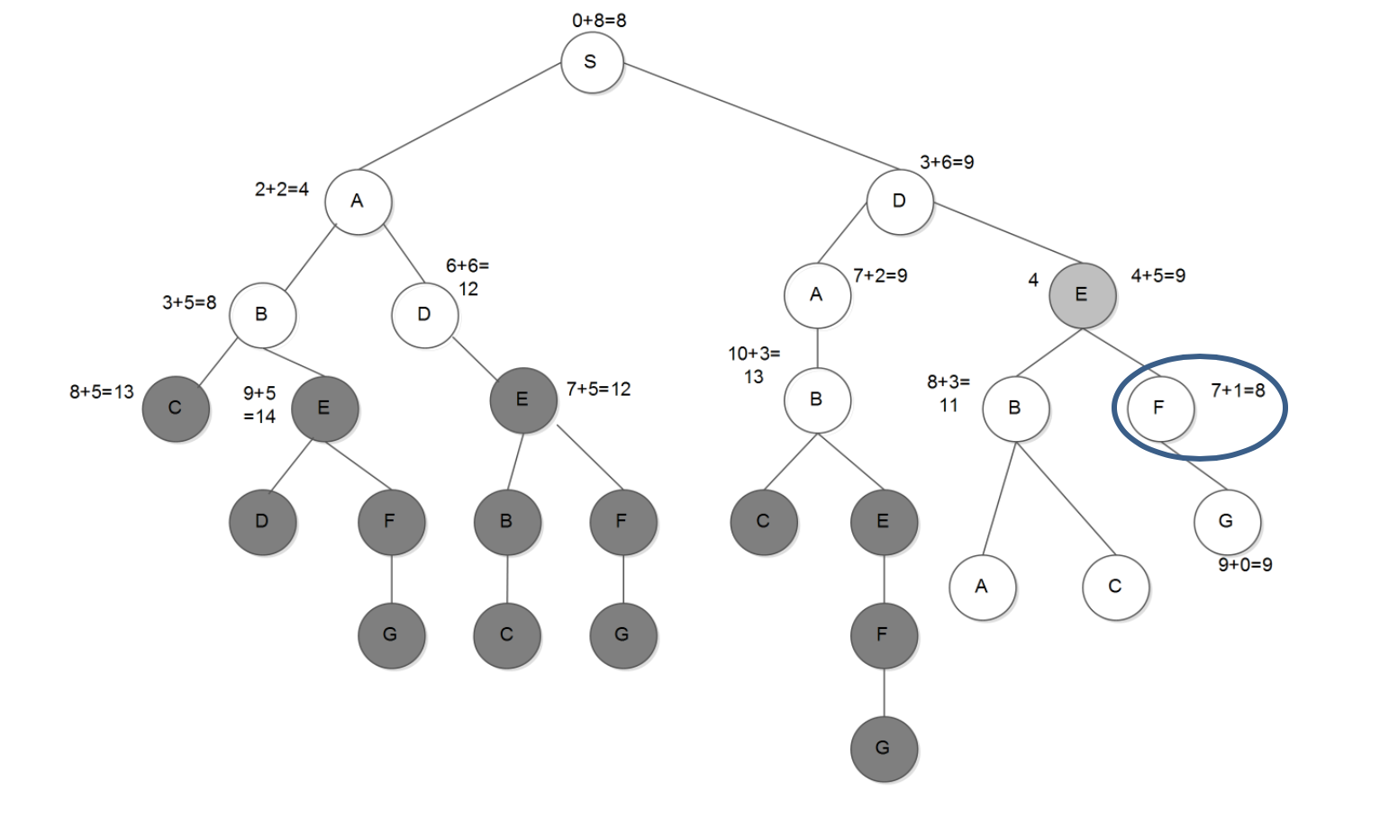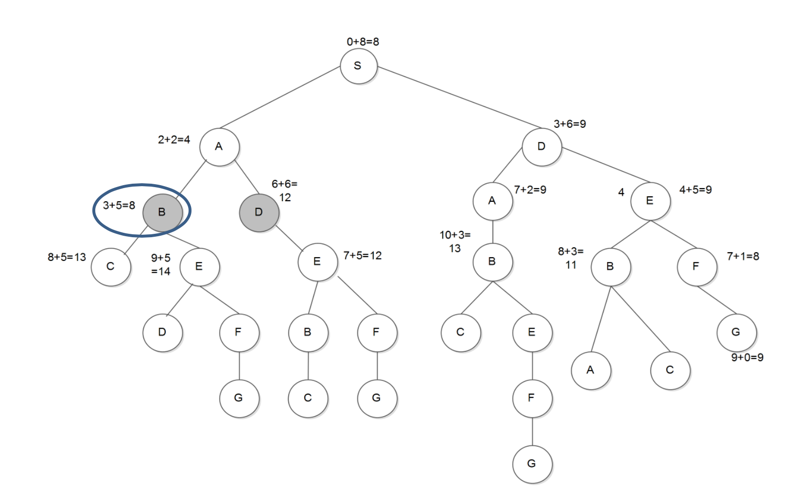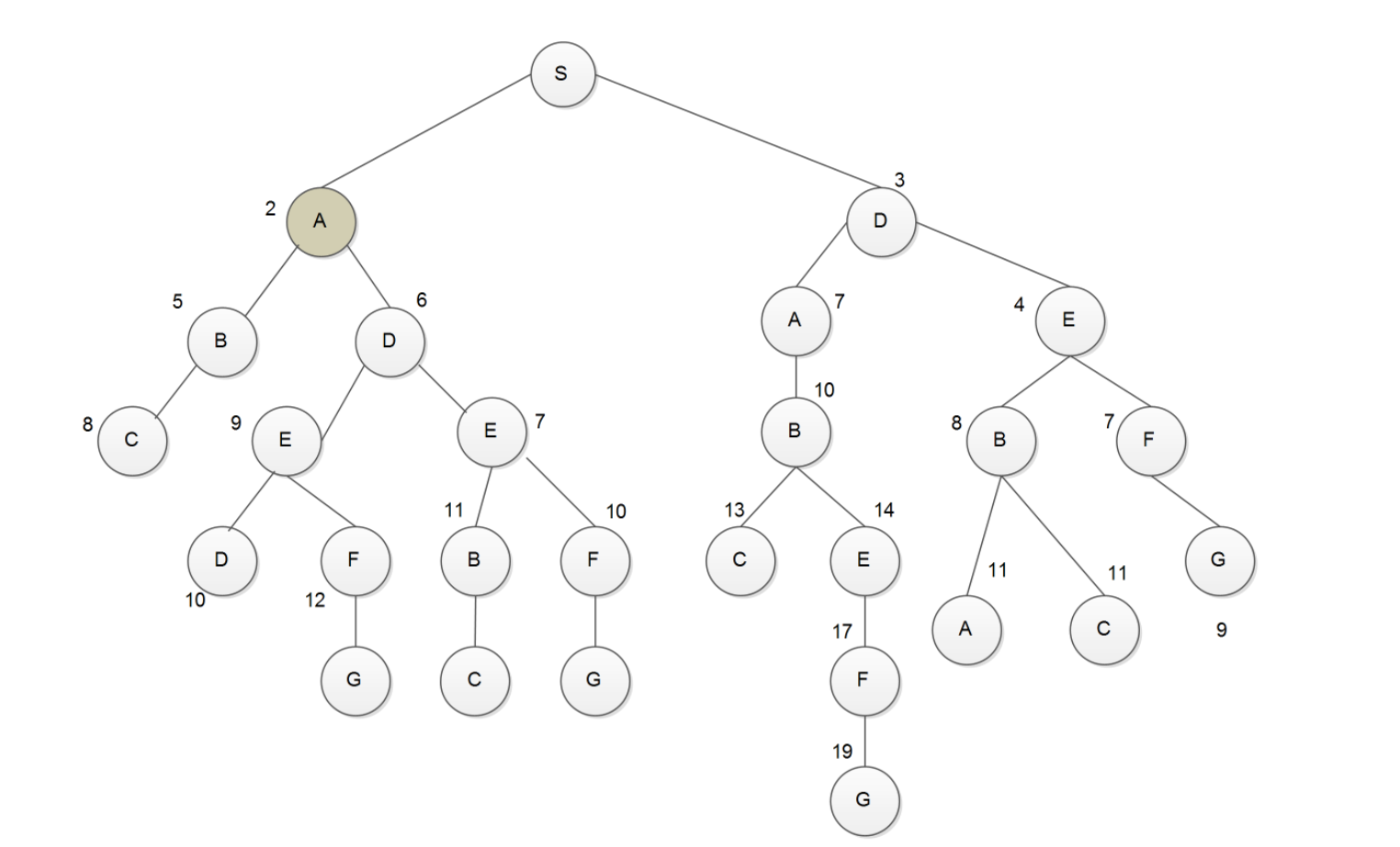 Notice that we have saved ourselves from traversing a considerable portion of the tree and still have found the optimal solution. The basic idea was to reduce the search space by binding the paths that exceed the path length from S to G.