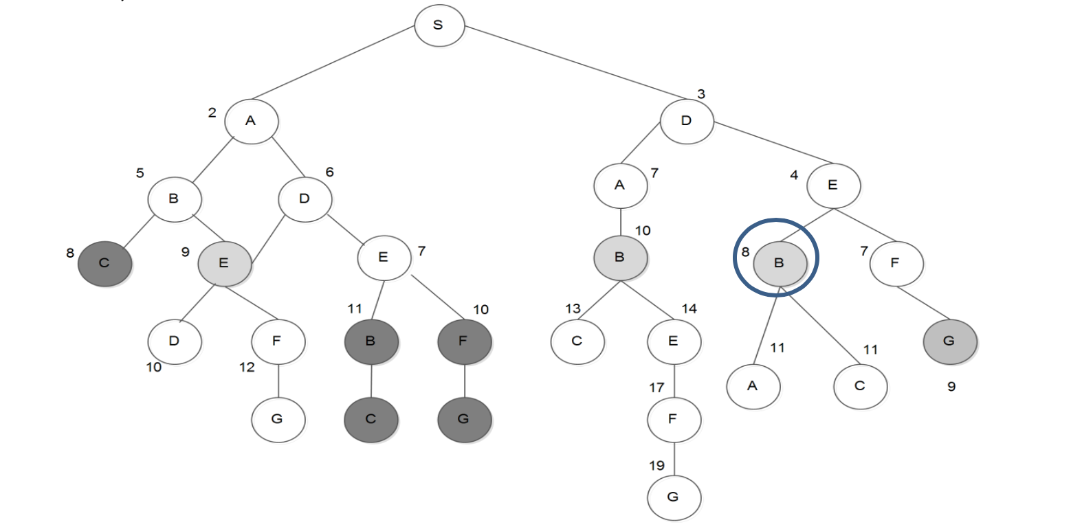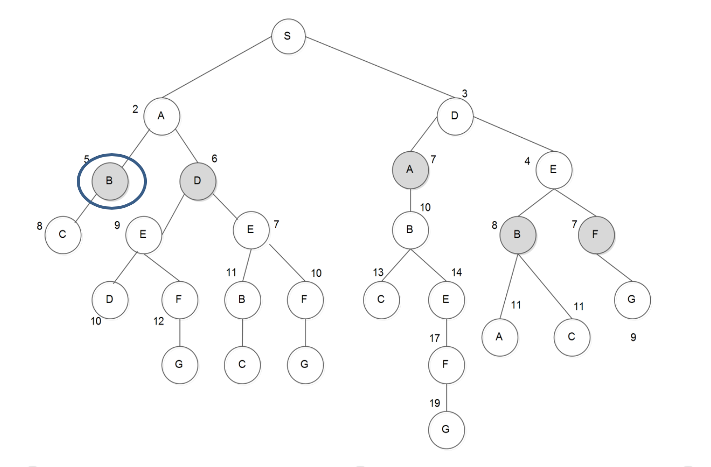 The length of the complete path from S to G is 9. Also, note that while traveling from S to B we have already covered a distance of 9 units. So traveling further from S D A B to some other node will make the path longer. So we ignore any further paths ahead of the path S D A B.