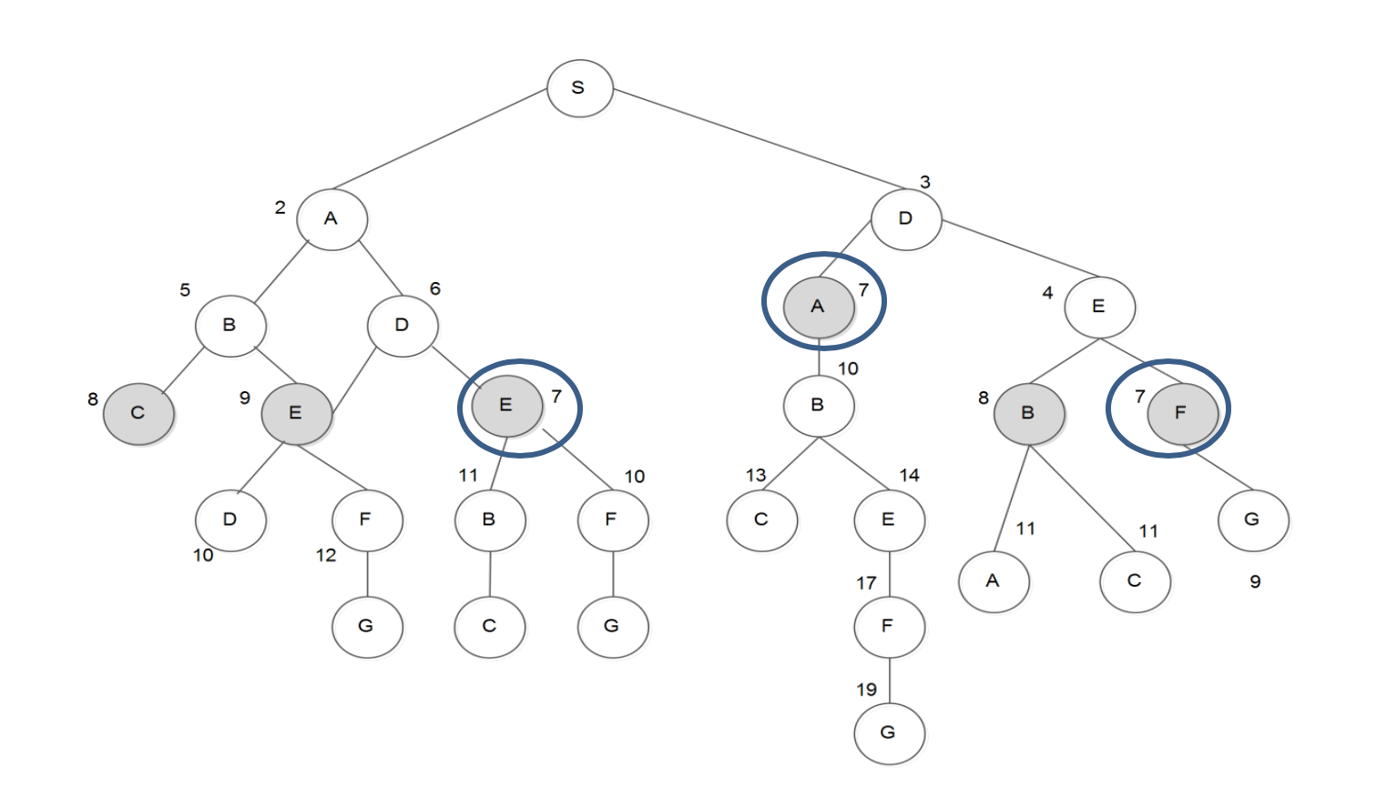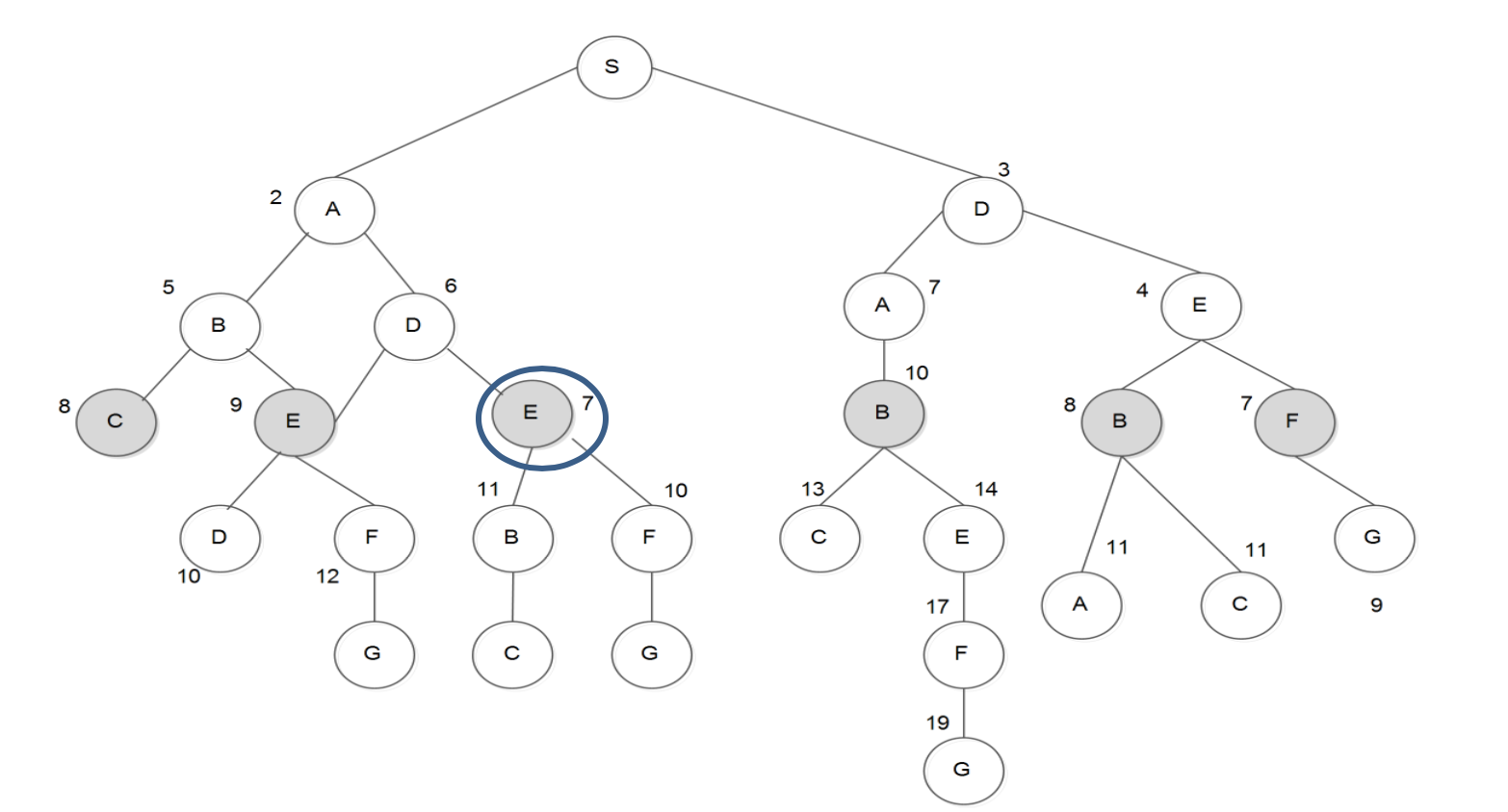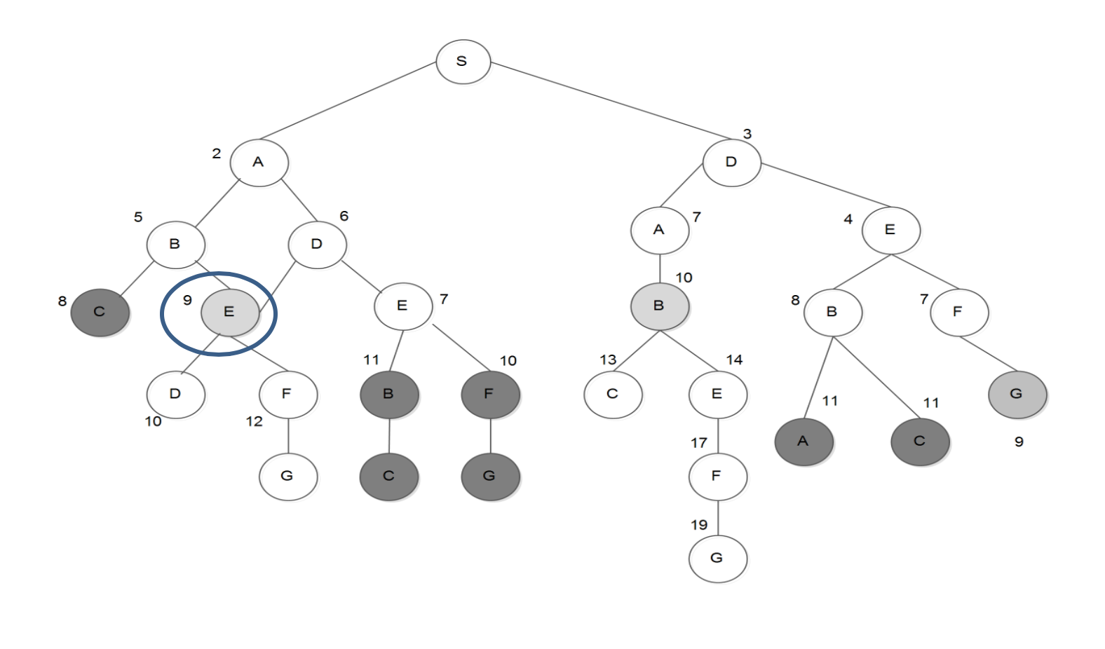 When we explore E we find out that if we follow this path further, our path length will increase beyond 9 which is the distance of S to G. Hence we block all the further sub-trees along this path, as shown in the diagram below.
