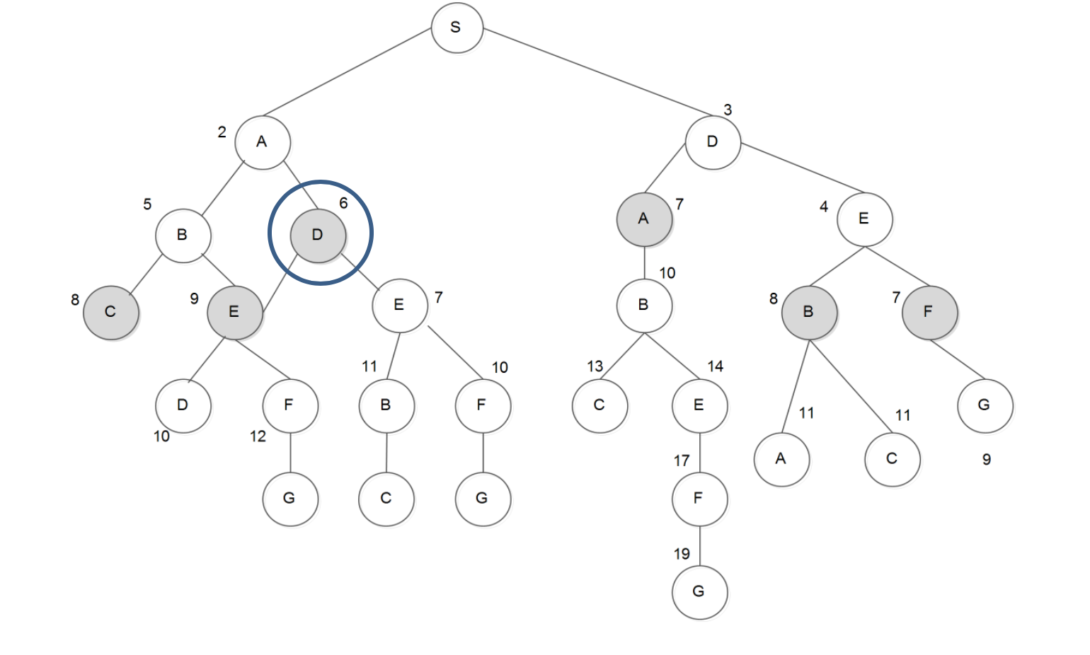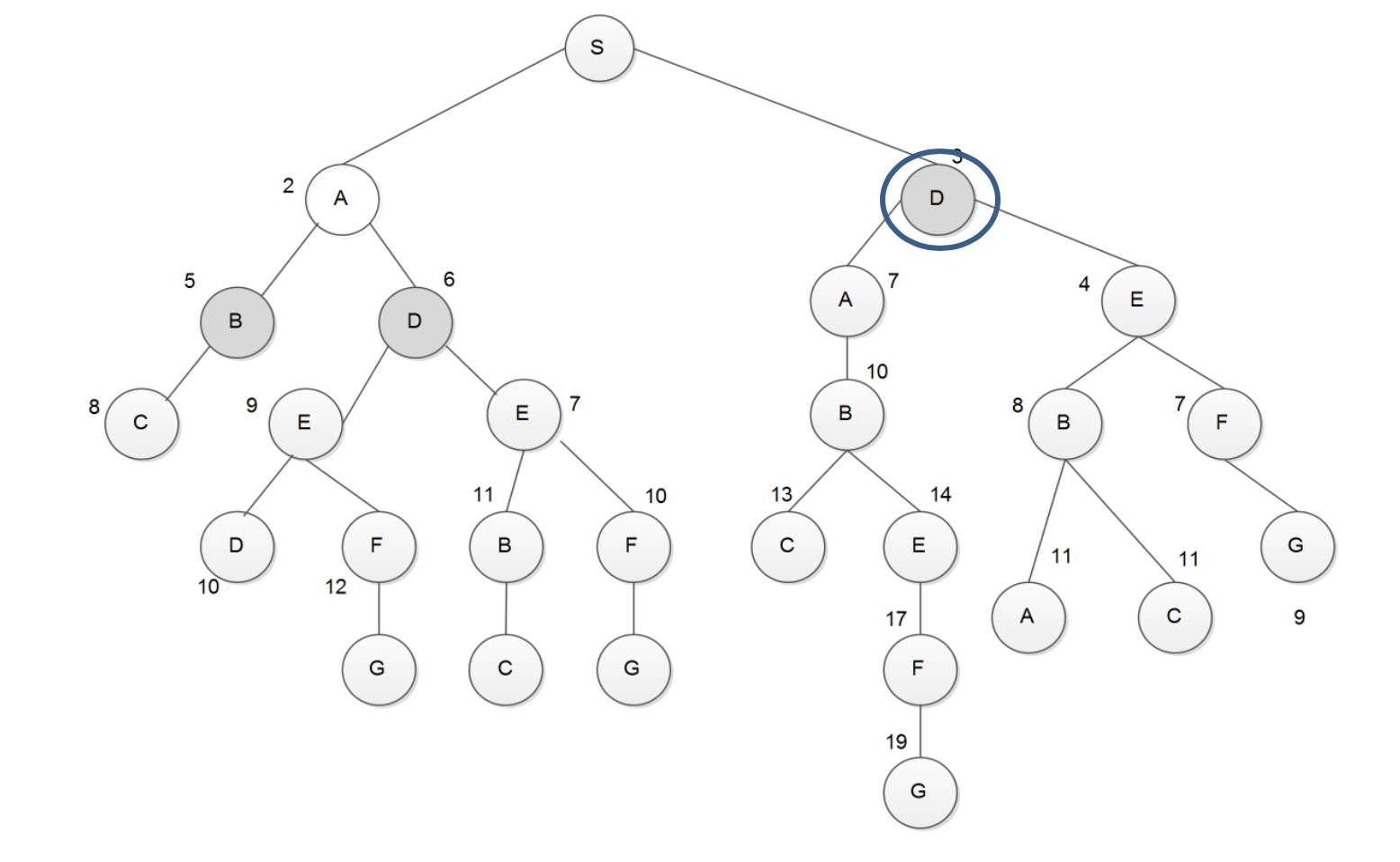 From S the options to travel are B and D, the children of A and D the child of S. Among these, D the child of S is the best option. So we explore D.