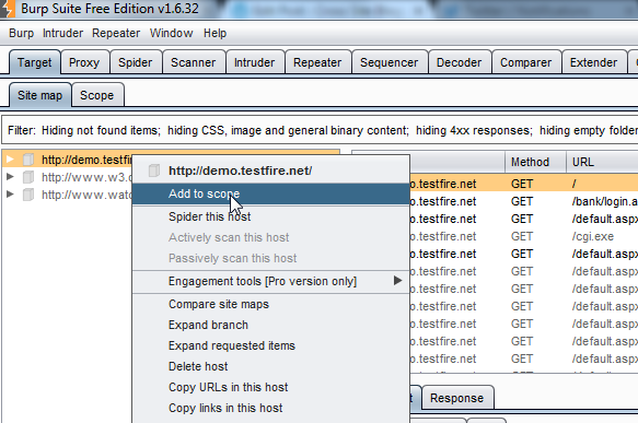 Burp Suite's spider tools are really great and helpful when you are doing your starting tests for the web application. It will create a full list of the URLs found on the site HTML responses as you navigate your way around. To use it go to Target tab then click on the domain and Add to Scope :
