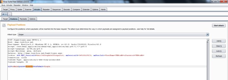 - Sniper - This uses a single payload set. It targets each payload position in turn and places each payload in that place in turn. This attack type is use full for fuzzing attacks to find common vulnerabilities. The total number of requests generated in the attack is the product of the number of positions and the number of payloads in the payload set.