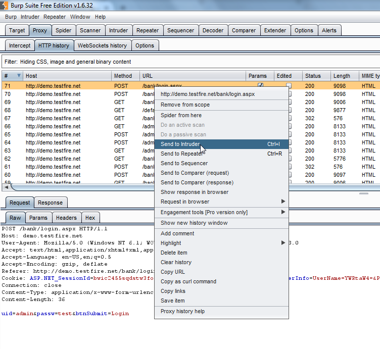 I'll use a basic example to walk you through the setup. We will try to use a brute force attack to hack into an admin panel on the login screen taking into consideration that there are no account lockouts in place. First of all, got the HTTP history and right-click on the request we want to test and select "Send to Intruder":
