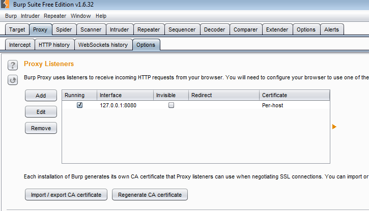 The intercepting proxy is the first step and leads the foundation of any web application penetration test you are conducting. Burp Suite proxy syncs well with all other tools present within it. The first step of using the intercepting proxy is to set up the proxy listener (Found under proxy -> Options). I have mine set to the default setting which is localhost (127.0.0.1) and port 8080: