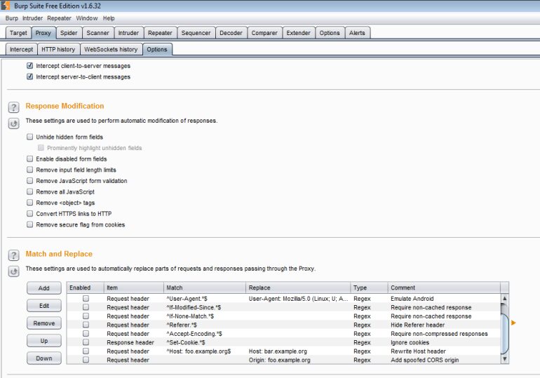 And in the Proxy there is another very useful feature which is automatic request/response modification it can be used to disable Javascript form validation and other things and you can use to match and replace parts of requests or response :