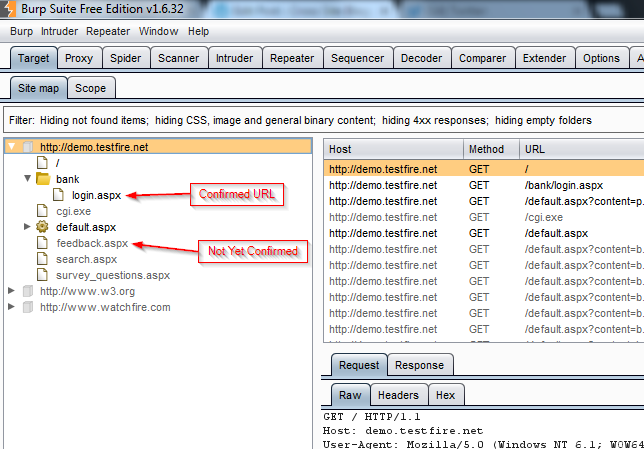 Now back in the Site Map, we can see a list of all URLs. A black URL means that we have successfully navigated to that page or the spider has found that on the site and has confirmed it as valid. And a gray URL means that the spider has found it in site the HTML code of the response but is still nor confirmed as valid :