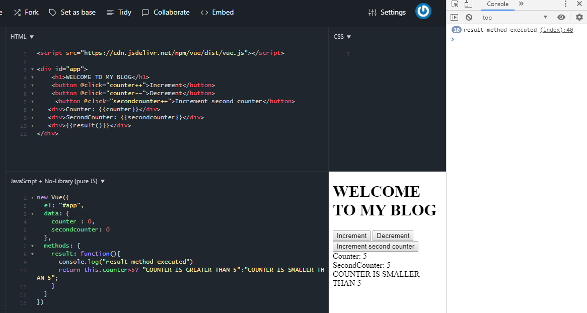I am going to explain this with the help of example where we have a counter data property in our VUE instance and we want to increment it when we click the increment button and decrement when we click decrement button. Then we want to call a method result that will return a string based on the value of counter i.e it is greater or less than 5.