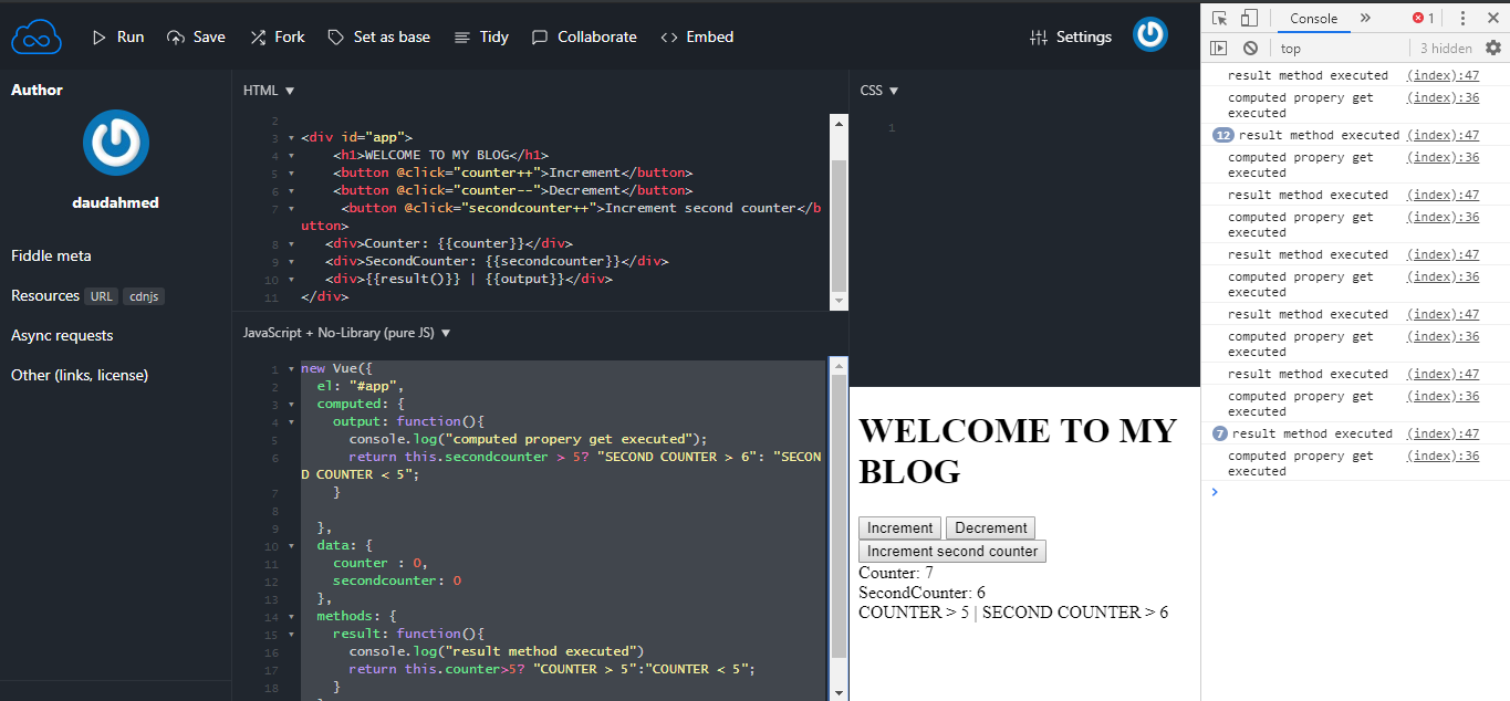 Now, we can see in the console that result function is executed each time regardless of which property we are changing counter or secondcounter but computed property only got executed when we are changing secondcounter property because VUE.JS know that it depends on secondcounter property.