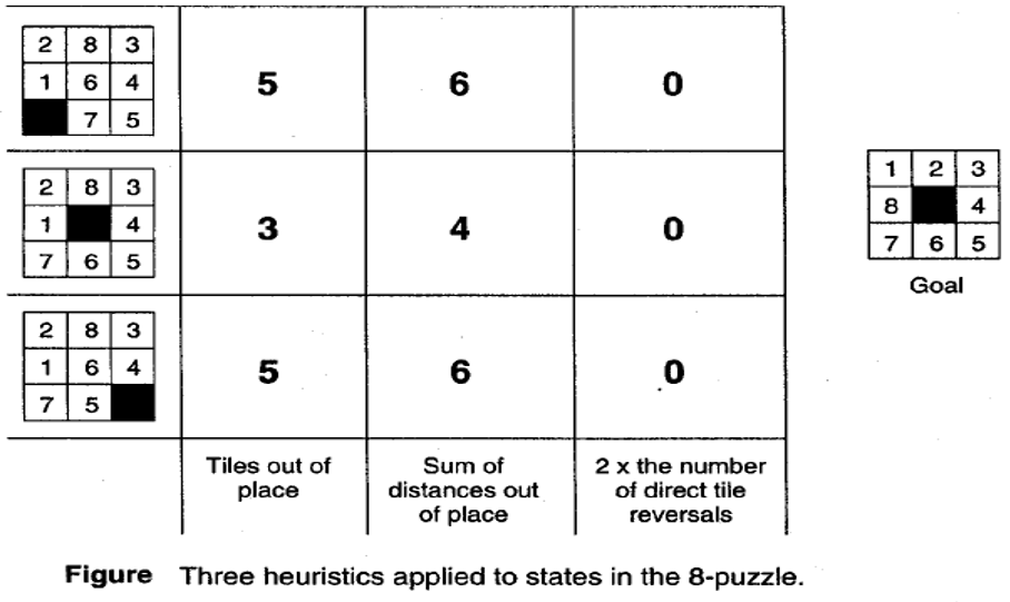 So, a better heuristic may be the sum of distances for each out of place tile. Both of these explained heuristics can be criticized for failing to acknowledge the difficulty of tilt reversal. That is if two tiles are next to each other and the goal requires their being in the opposite locations. It takes more than two moves to put them back in place. E.g.