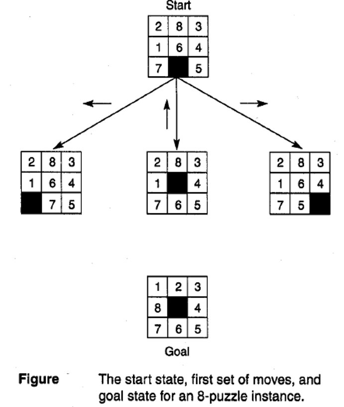 We now evaluate the performance of several different heuristics for solving the 8-puzzle, The following figure shows a start and goal state for the 8-puzzle, along with the first three states generated in the search.