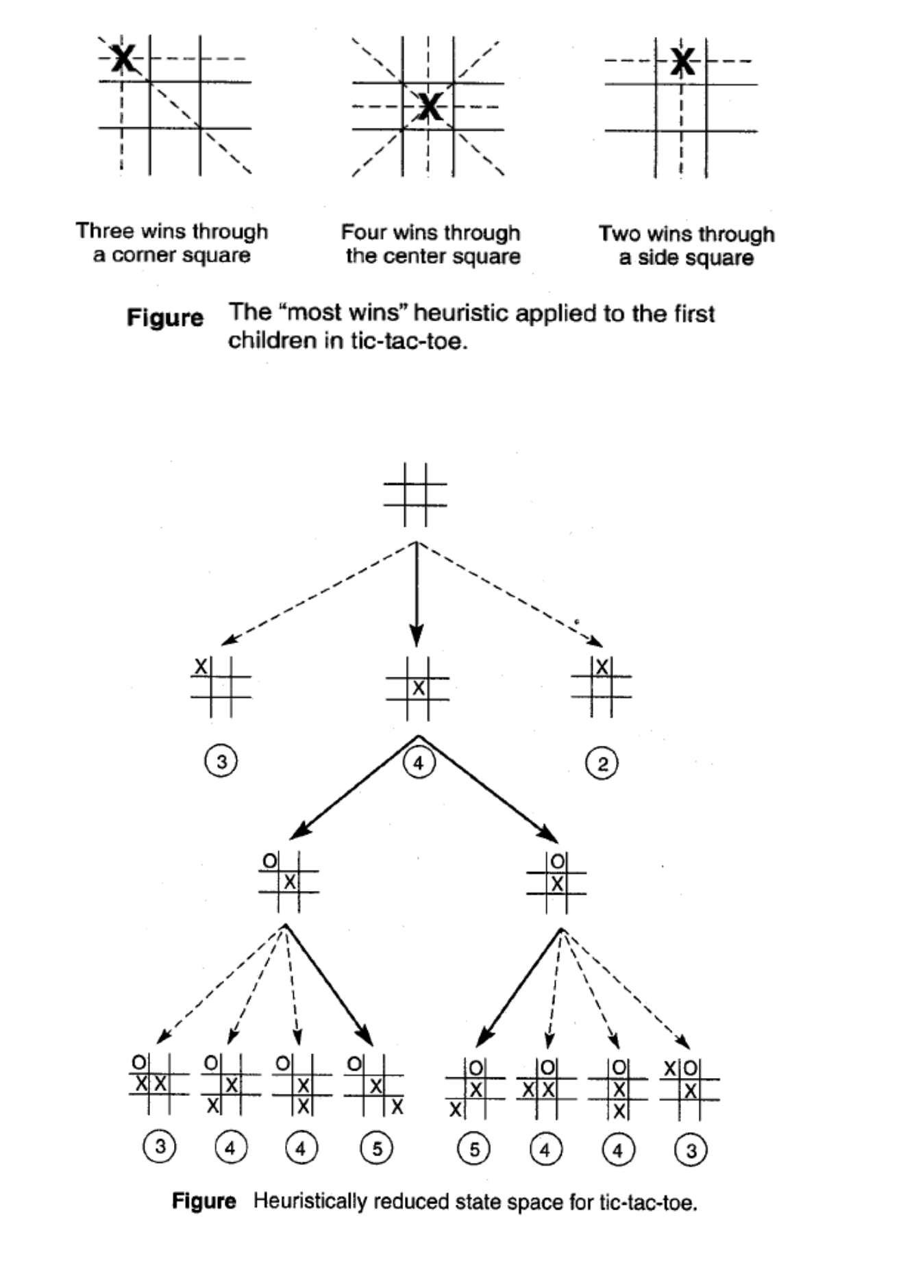 A simple heuristic, however, can almost eliminate search entirely: we may move to the board in which X has the most winning lines. In case of a state with equal numbers of potential wins, take the first such state found. The algorithm then selects and moves to the state with the highest heuristic value. In this case, X takes the center of the grid. The opponent will have only two choices to go head. And after that again the most winning option will be selected.