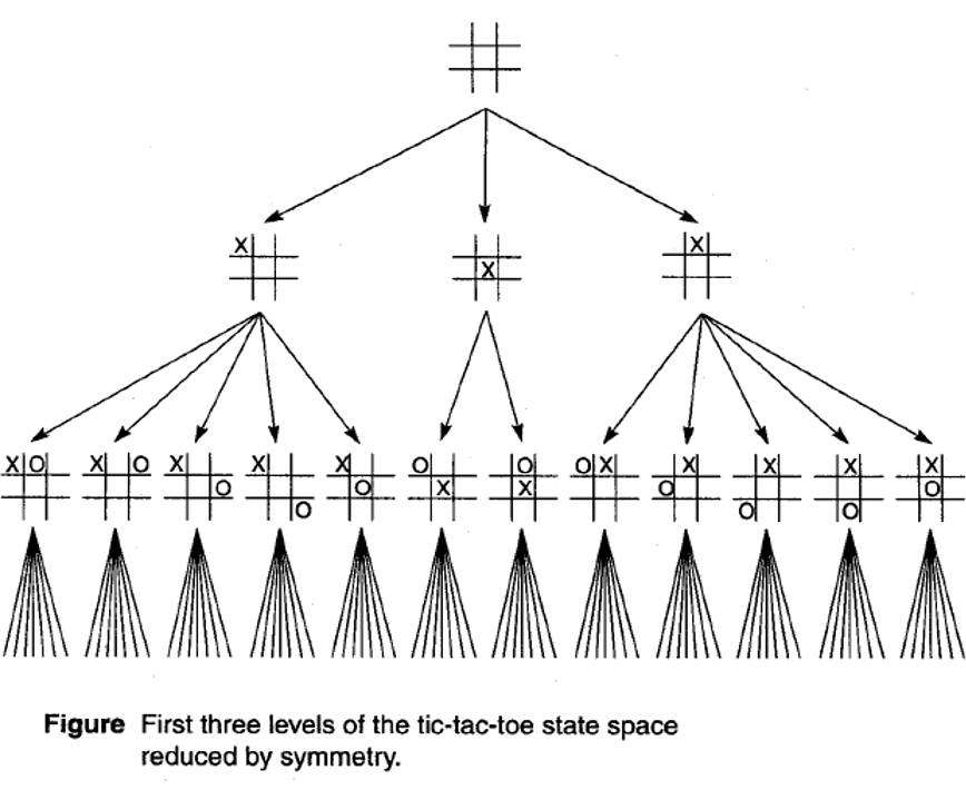 In a complete search space, there are 9! Possible state to search, through heuristics this search can be reduced. Symmetry reduction decreases the search space. Many problem configurations are actually equivalent under symmetric operation on the game board. In tic-tak, there are only three initial moves: to a corner, to the center of a side and to the center of the grid.