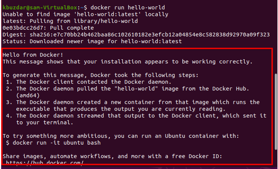 Once you installed Docker on your system, you can test its working by using the following command that will open a container and will execute the Hello World command: