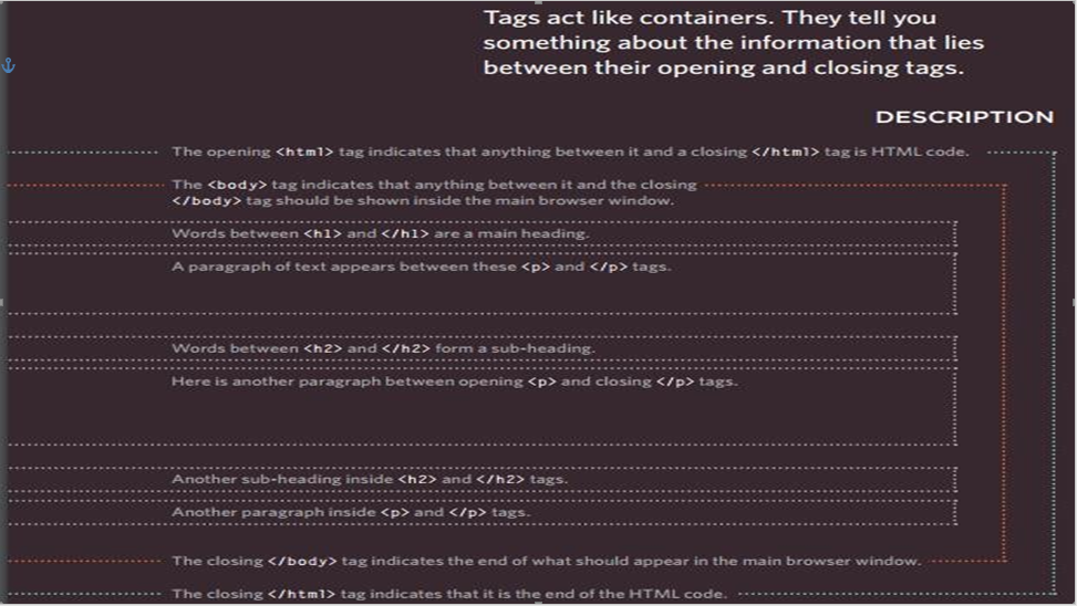 - Meta-information is distinguished from content by using tags. A tag is a tag-name enclosed in angle Tags usually come in pairs: an opening tag and a closing tag, which is the same tag-name preceded by a slash.