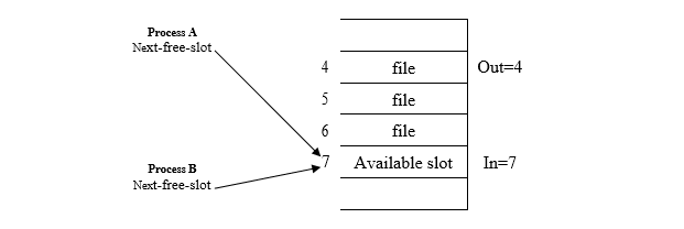 - Process A found from “In” that slot 7 is free, so it recorded this number in its variable i.e. next free slot = 7.