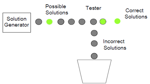 We call this “hit and trial” approach the “Generate and Test” approach. We generate different combinations to solve our problem, and the one which solves the problem is taken as the correct solution. The rest of the combinations that we try are considered as incorrect solutions and hence are destroyed.