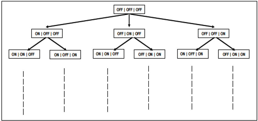 It shows the problem of switching on the light by a child in a graphical form. Each rectangle represents the state of the switchboard. OFF | OFF| OFF means that all the three switches are OFF. Similarly OFF| ON | OFF means that the first and the last switch is OFF and the middle one is ON. Starting from the state when all the switches are OFF the child can proceed in any of the three ways by switching either one of the switches ON.