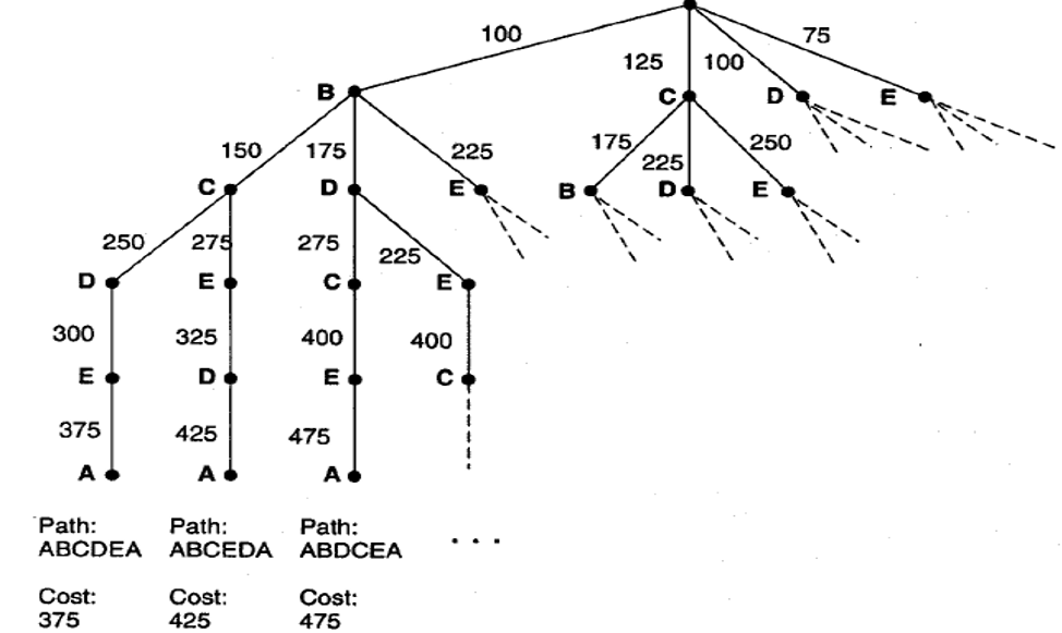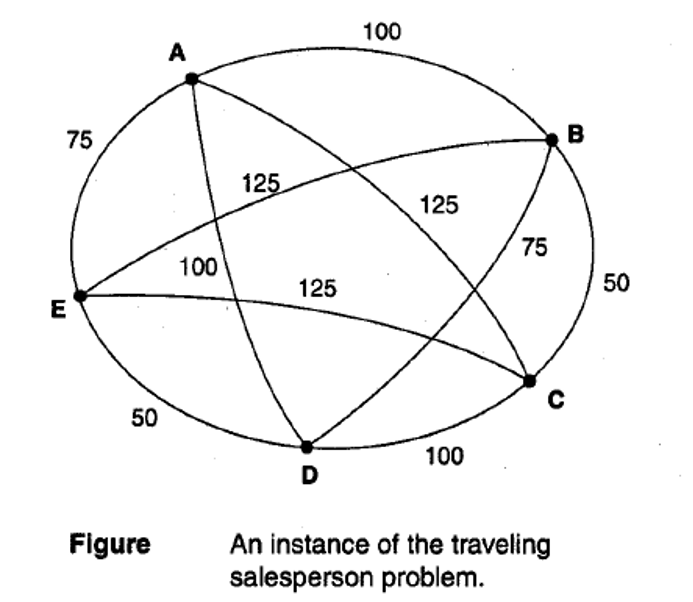 Suppose a salesperson has five cities to visit and then must return home. The goal of the problem is to find the shortest path for the salesperson to travel, visiting each city, and they returning to the starting city.
