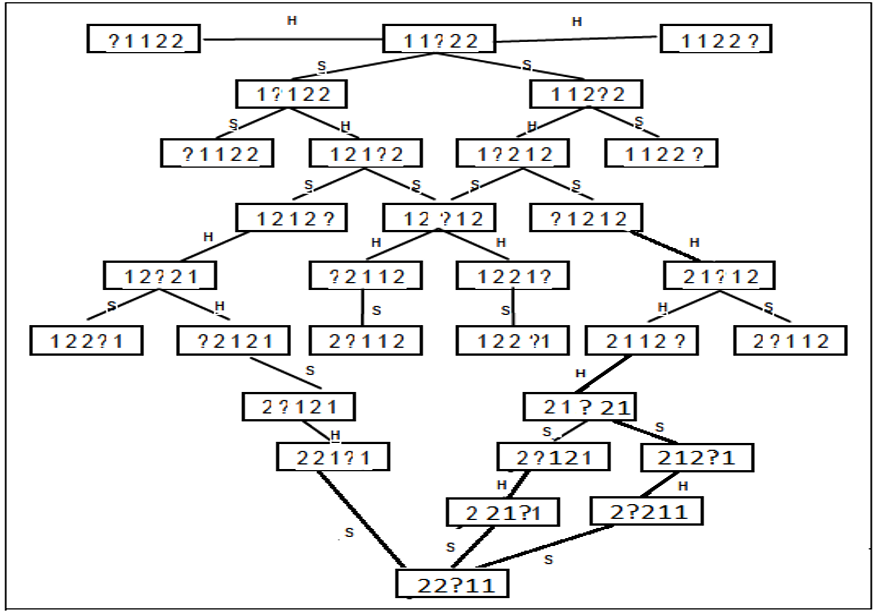 The above game can be better represented as a tree to find possible solutions. A tree sort of structure enumerates all the possible states and moves. Looking at this diagram we can easily figure out the solution to our problem. This tree-like structure actually represents the “Solution Space” of this problem.