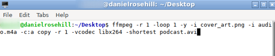 ffmpeg -r 1 -loop 1 -y -i cover_art.png -i audio.m4a -c:a copy -r 1 -vcodec libx264 -shortest podcast.avi